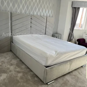 Incorporating a modern chevron design pattern the Atlas Wide Headboard Gold and Silver Trim Bed frames extra wide bed will look great in a modern bedroom.