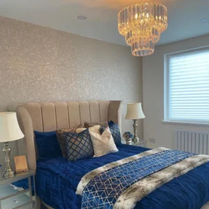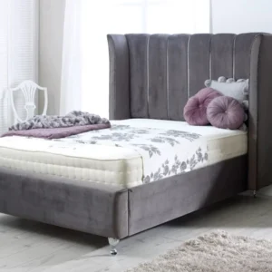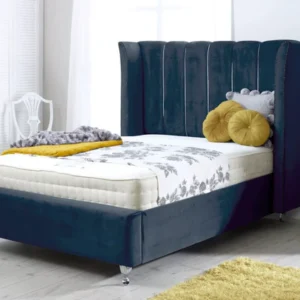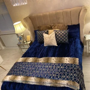 This bed features an imposing curved wing headboard with contrast piping and metal beading. The Chunky upholstered panels make this a very comfortable bed with a luxury feel.