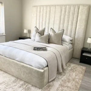 Tall Chateaux Paneled floor to ceiling headboard bed frame has the Option of Practical gas lift storage system; the mattress lifts up with a slight tug on the handle revealing the space underneath for storage is. This does not affect the look of the bed and is a great method of creating storage .