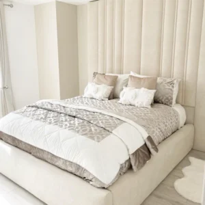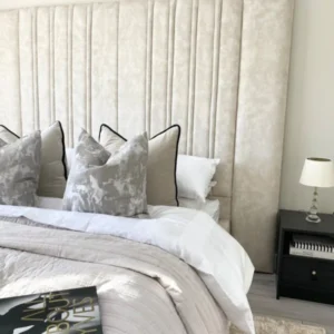 The headboard of the Tall Chateaux Paneled floor to ceiling headboard bed frame  features a vertical extra Tall 85-Inch design. This bed frame is designed for those who appreciate the finer things in life and demand the utmost in comfort and elegance.